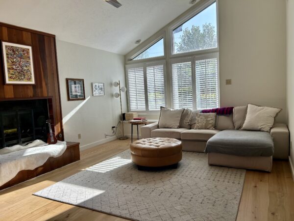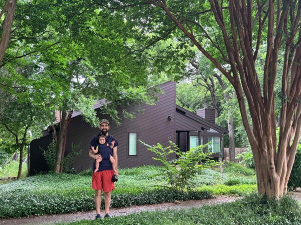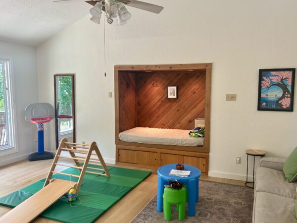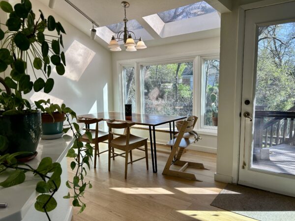 We have a beautiful modern house with four bedrooms, two and a half bathrooms, and two living areas – lots of room to spread out and big, bright windows. One of the living areas is a playroom that overlooks a creek. Our yard is about a third of an acre, and it backs right up to a greenbelt and peaceful creek. We recently planted a pollinator garden and we love watching the butterflies, bees and birds from our deck – it’s like having our own little slice of nature in the city!