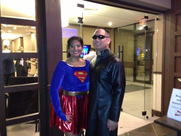 We first met at a Salsa Dancing Social. After months of dancing and getting to know each other, we had our first date. As we learned more about each other, we realized how we felt at home with one another. It was the Halloween season, so we enjoyed getting dressed up and attending Halloween salsa socials and family friend Halloween parties. We were falling in Love.